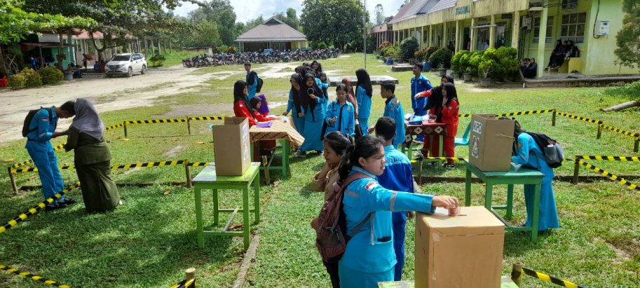 Siswa SMKN 2 Mandau mendahului pelaksanaan Pesta Demokrasi di Indonesia dalam rangka pemilihan Ketua...